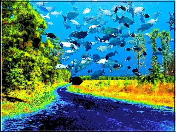 I really like the "Raiders of the Dream" Into Blue! It sounds like it would be a good title for a spiritually centered adventure film! A young team of lucid dreamers embark on a mission to recapture the dreams of several lost souls who have wondered to close to the overly rational mind-set.... the setting for the rescue could take place in a church with lightning all about.... I think it would work....! :^) I loved the merbaby picture as well, it's one of my favorites! The bubbles were from what's called a "brush". It's actually an image-stamp (black and white) that one colors as needed, and the tail itself was from a picture of piece of pottery. The space boat was a lot of fun to do... combined all sorts of stuff to make that one! You may remember this one below from my posting it on SF some time ago. It's a early morning panorama, composed of 5 separate pictures and then blended into one. I've always loved this photo... and it was simple luck that had the kids there, and a rainbow in the background. This was one image that I didn't add anything to... :^)
