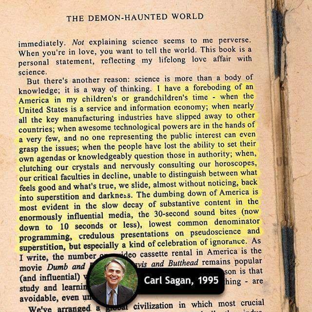 SI you have a quote here from Carl Sagan. I really enjoyed his 'Cosmos' series. Since someone highlighted a section of his talk here and it fits nicely into the social context that is now unfolding on the earth plain and also the relationship i have for instance with Eric and Kelly (and others also) here on the site. With that being said he also had a one dimensional paradigmatic mind and was unable to see beyond the lens of his empirical mind. Like so many scientists and people he was unwilling to use his observational abilities to expand his outlook. In many relationships as well as social issues confronting humanity there are many levels of understanding and functioning. Many people see thru the optics of their own mindsets, failing to see that this earth existence we experience and our relations with the people on it do not comfortably fit into the biased views of others. Anyone can observe astrology, crystals or even two individuals and 'think' they understand the dynamics and the conflicts they have with one another failing to take into account the incredible similarities and symbiosis taking place between those people on another level that keeps them twin souls from one life to another. So, in fact the 'critical faculties in decline' that Carl Sagan expresses here can be a barrier and obstacle to seeing and understanding in a wider and more encompassing view that actually speaks of the true realty of what is happening to our civilization and the working of for instance two individuals in their current karmic interplay.